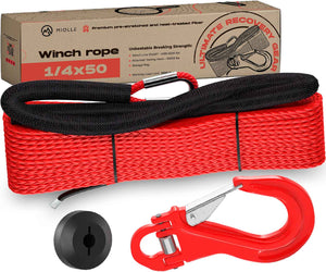 Miolle Pre-streched 1/4 Inch x 50 Feet 8200LBs (Lab Tested) Synthetic Winch Line Hook, Rubber Stopper and Black Protecting Sleeve ATV/UTV