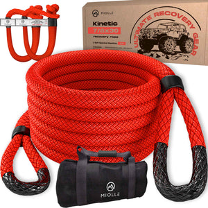 Heavy Duty Kinetic Recovery Rope - Miolle 1-1/4" x 30' Tow Rope, Red (53000 lbs), with 2 Spectra Fiber Soft Shackles 9/16' x 10" (54000 lbs)